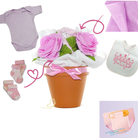Windeltorte Blumenstrauß im Tontopf | 5-teiliges Babyset | rosa