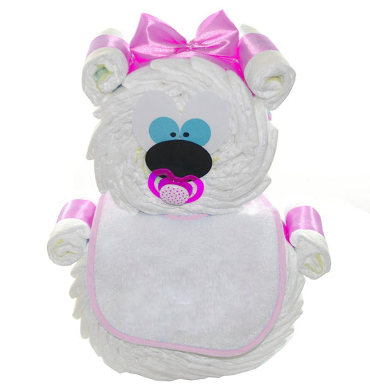 Premium Windeltorte rosa | Spieluhr Teddybär, Musselintuch, Lätzchen | Personalisierbar | 4-stöckig